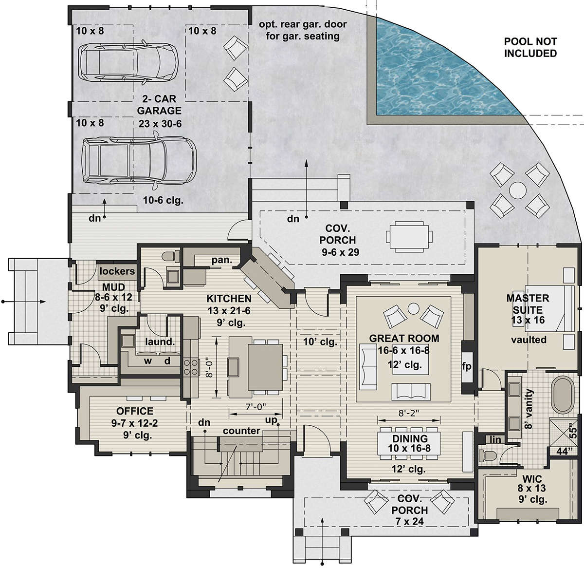 The main-level primary suite boasts a vaulted ceiling and a luxurious bathroom complete with a freestanding tub, walk-in shower, private toilet area, and a large walk-in closet. A mudroom, guest half bath, and laundry room with built-in storage complete the main floor.