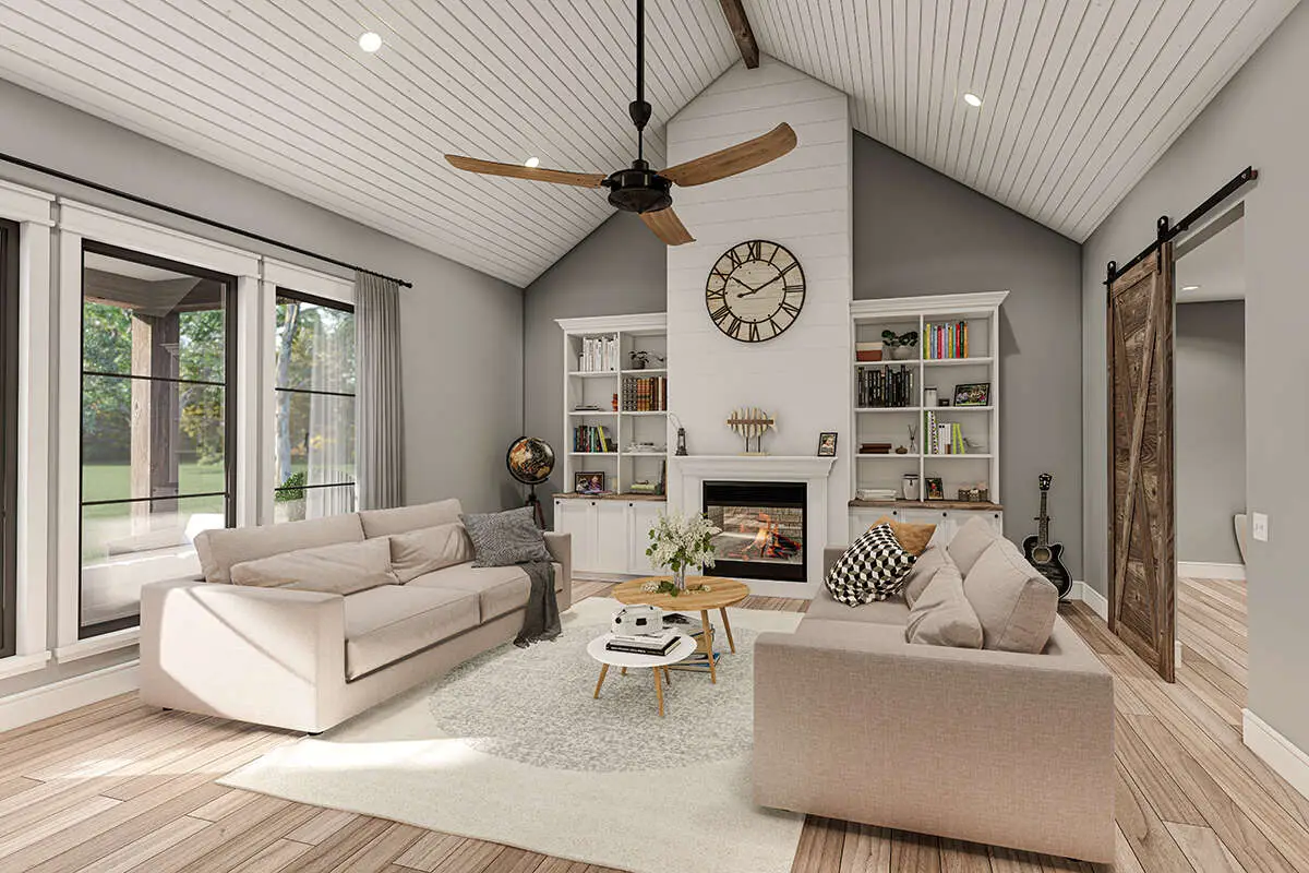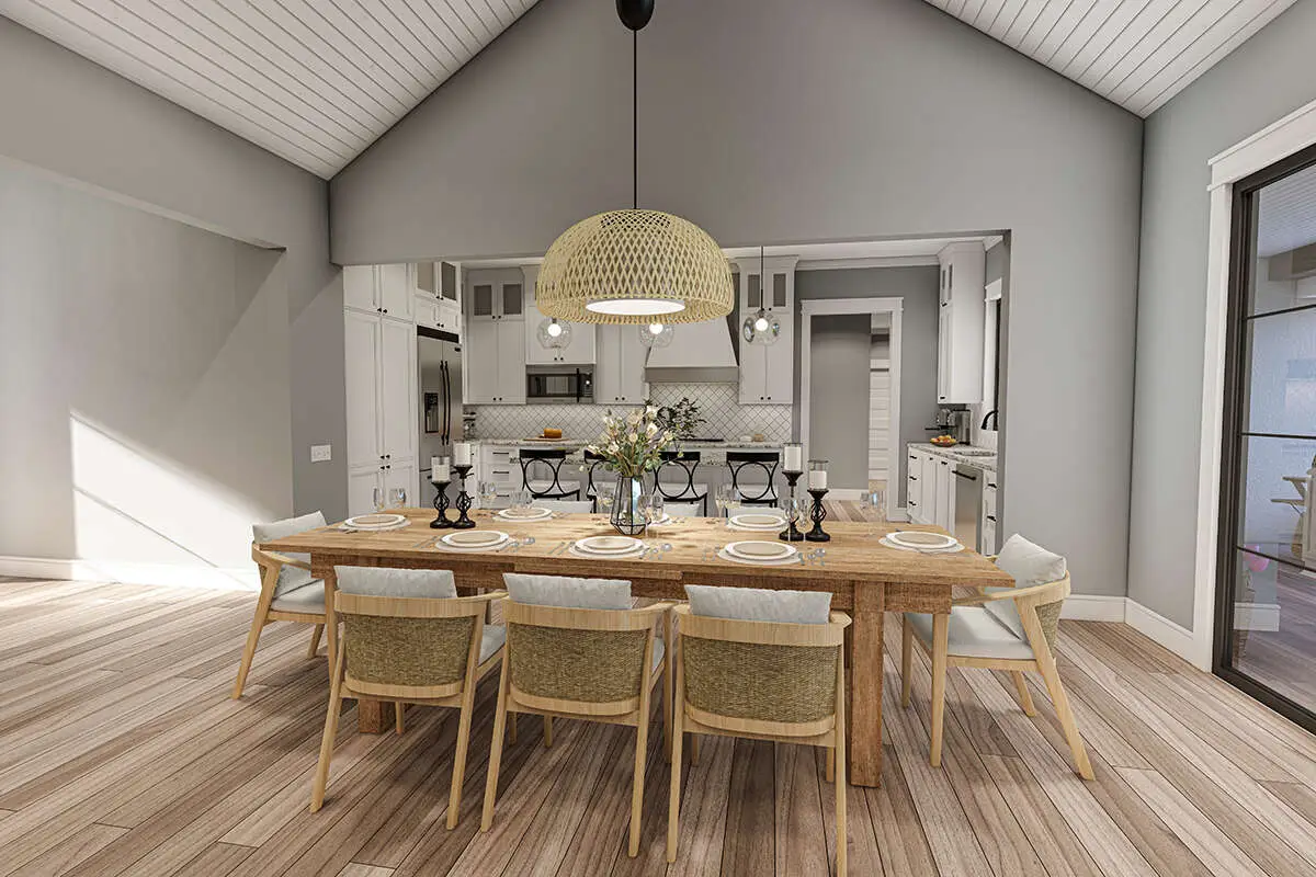 The open-concept layout includes a spacious great room and dining area with soaring ceilings, and windows that flood the space with natural light. French doors open onto a covered rear porch—perfect for year-round outdoor living. The kitchen is both stylish and functional, featuring a large island and generous cabinetry.