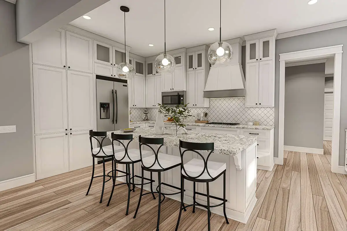Bold modern styling meets everyday comfort in this beautifully designed 2,295 sq. ft. home. The double-door front entrance welcomes you into a dramatic foyer with 11-foot ceilings.