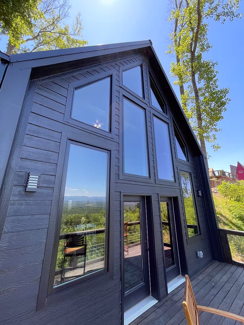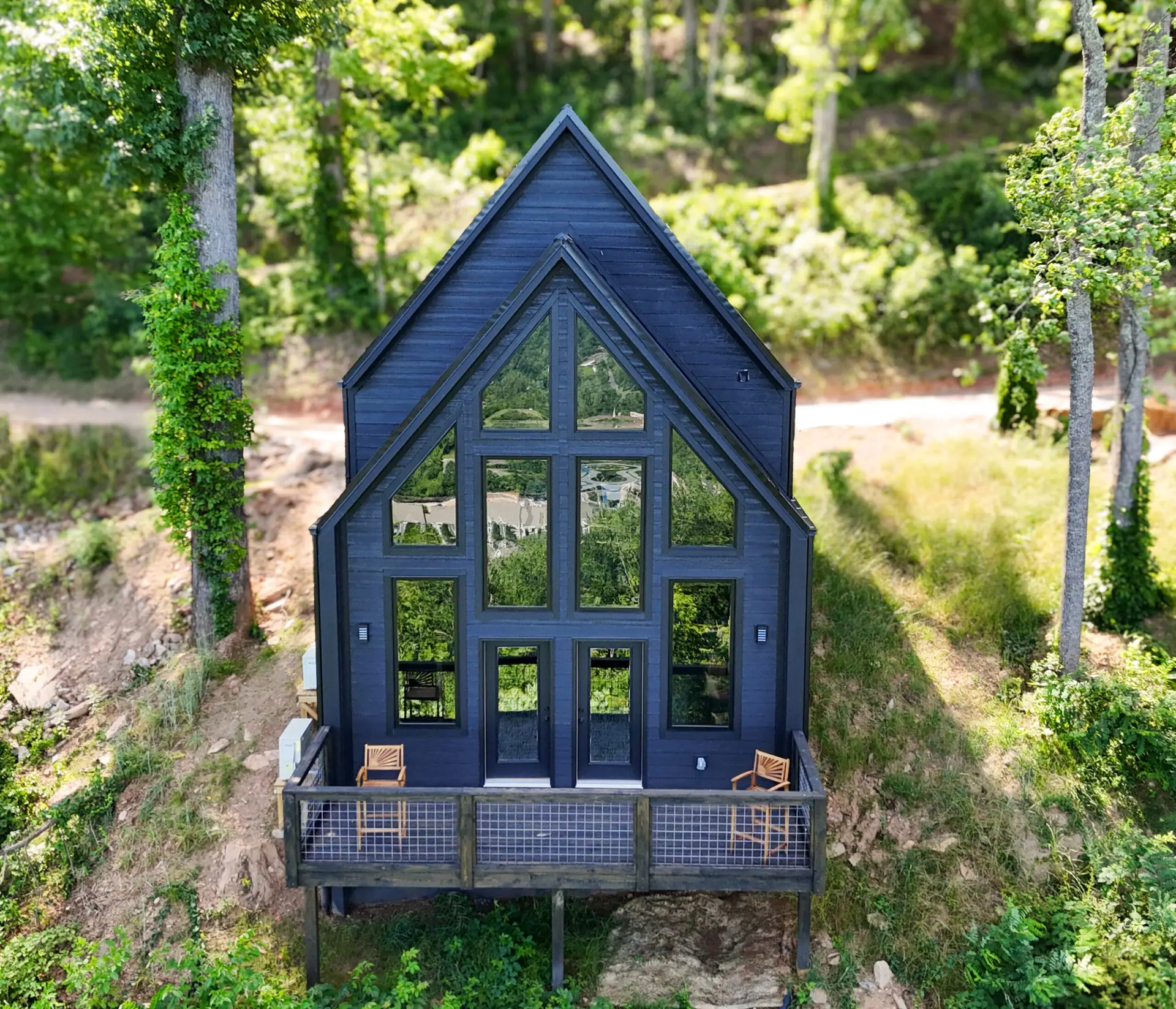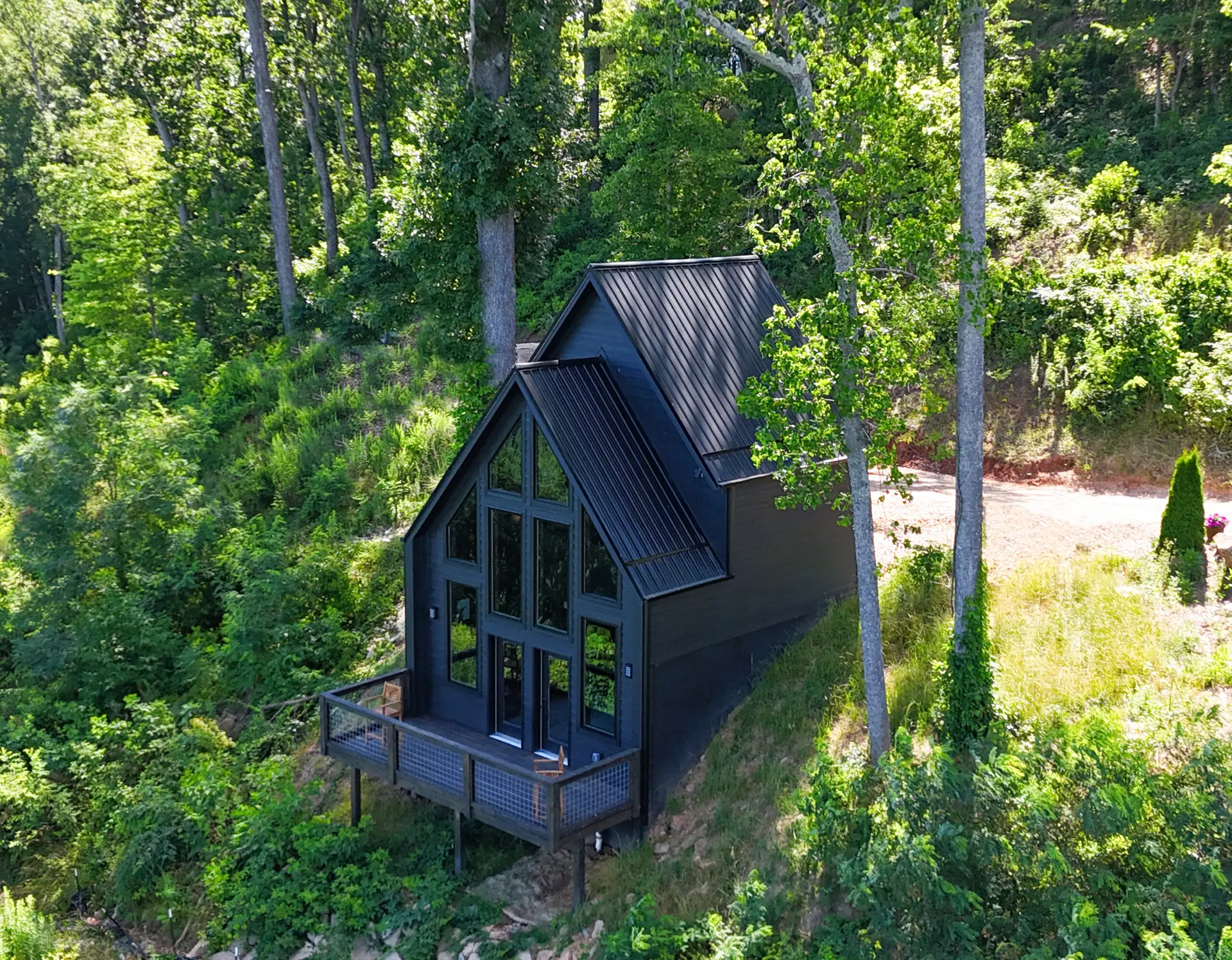 Welcome to The Harmony, a stunning commercial treehouse build that now serves as an unforgettable Airbnb rental. With its modern black exterior and bold architectural shapes, this unique treehouse is nestled on the side of a mountain in Asheville, NC, offering breathtaking mountain views through its large windows. Designed for those who appreciate sleek, contemporary design with a touch of nature, The Harmony offers a serene and elevated retreat. Discover photos below to see how our expert craftsmanship brought this extraordinary vision to life.