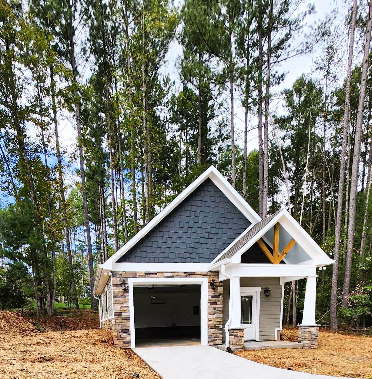 This project involved the addition of a garage in the Plantation Pointe community located in Granite Falls, North Carolina. The garage's exterior features a combination of wood composite siding and stone veneer.