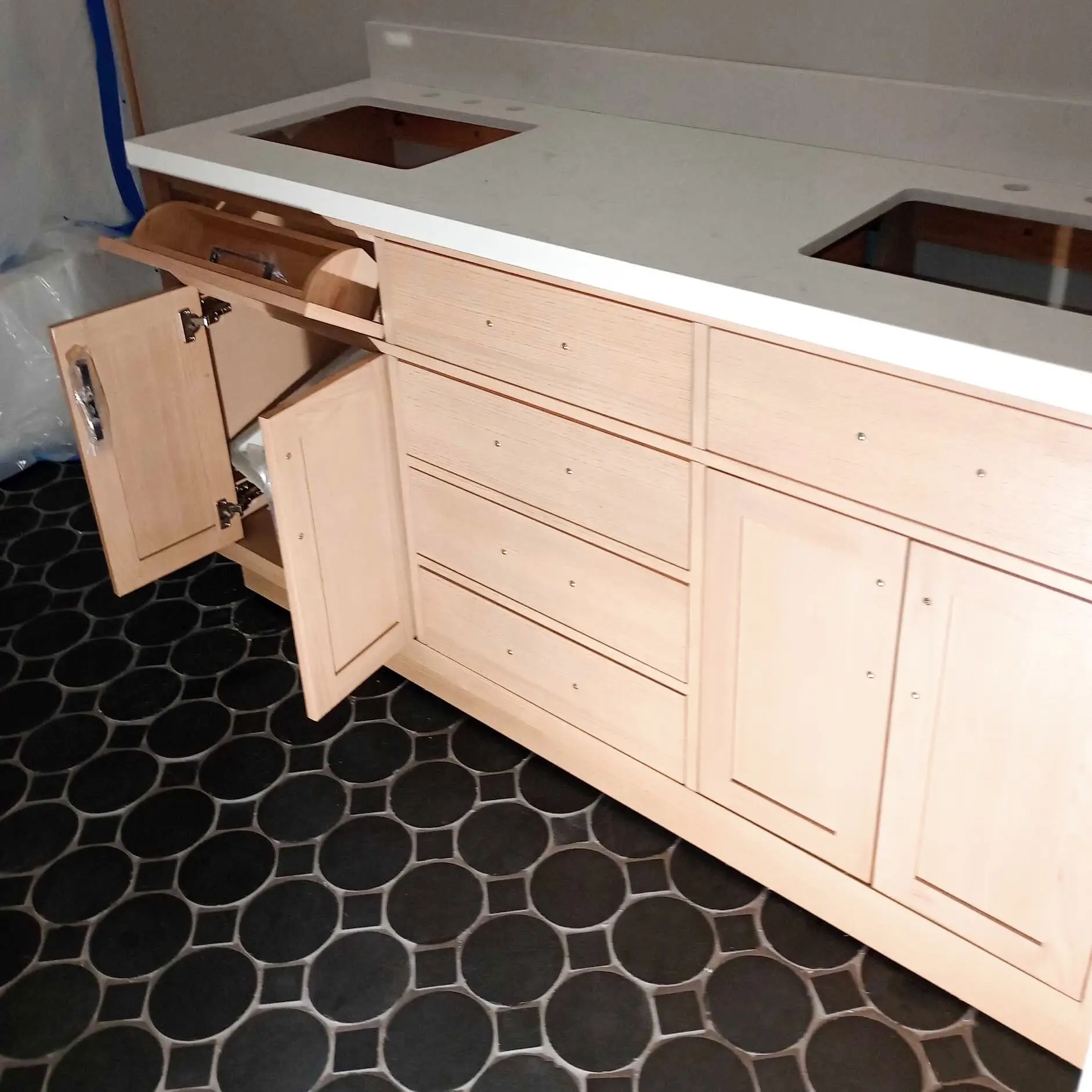 Work is underway on the Graves Remodel, and the design choices are shaping up to create a clean, modern space with warm, natural details. In the bathroom, the client selected black circular tile for the floor and wood-toned vanity cabinets, bringing in both texture and warmth. In the kitchen, the design features white cabinetry with white countertops for a bright and airy feel. A wood-colored cabinet hood will provide a striking contrast and add visual interest to the space. We’re excited to bring this vision to life!