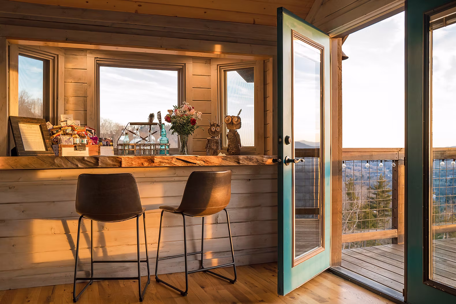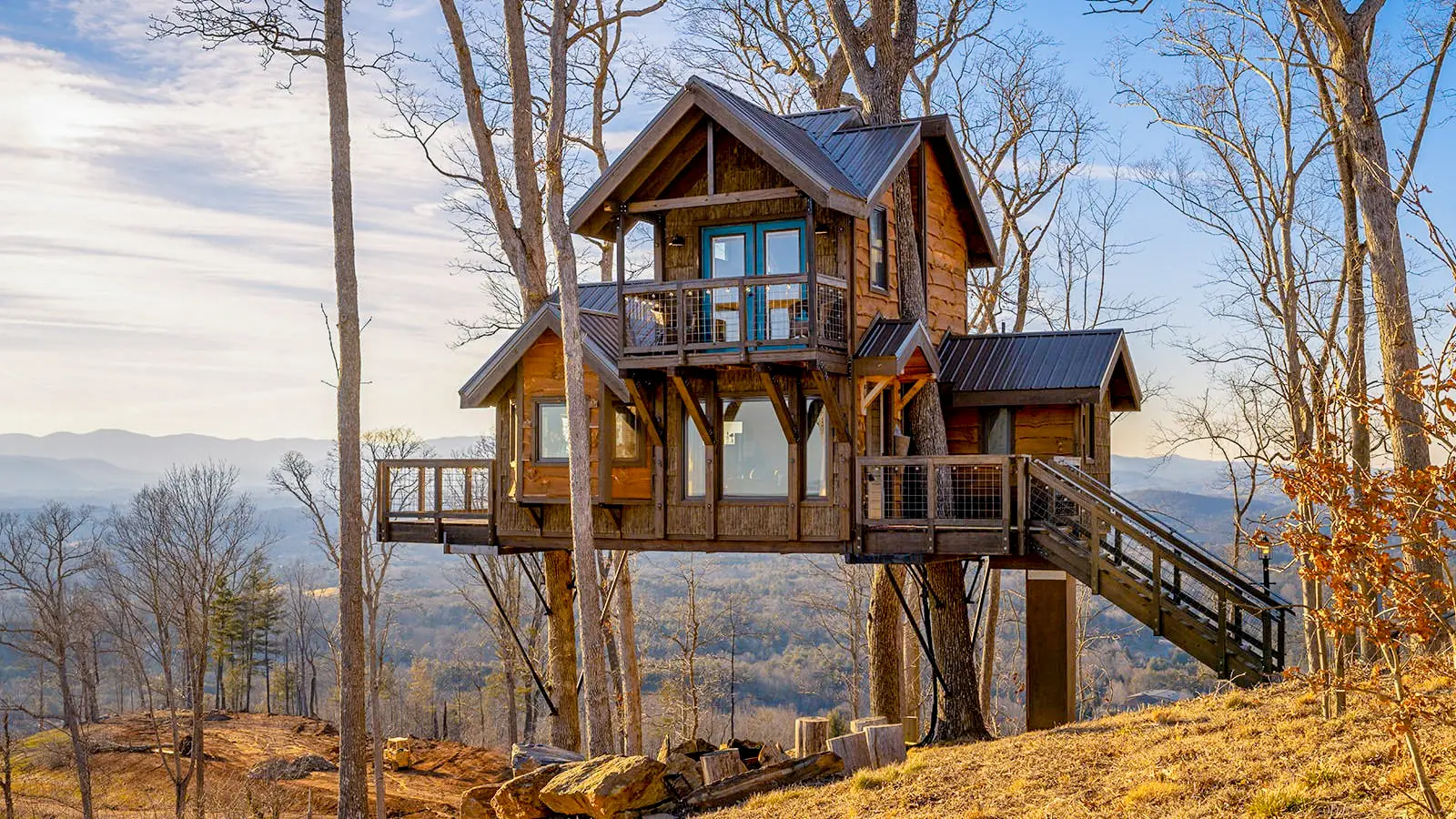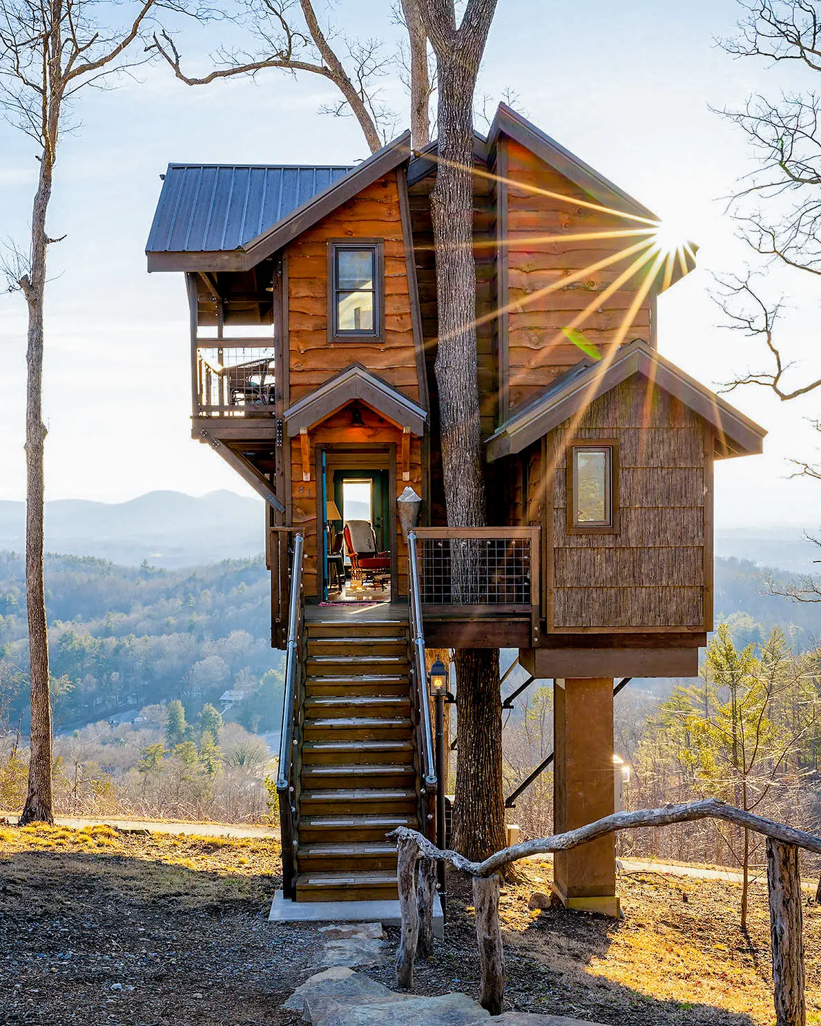 Step into The Sanctuary, our handcrafted treehouse nestled in Asheville, where nature and design intertwine. This one-of-a-kind structure was built with intention, creativity, and reverence for the mountains that surrounds it. At the heart of it all stands a living tree—our front exterior centerpiece—that rises through the architecture like a guardian of the space, grounding the entire build in the living landscape.